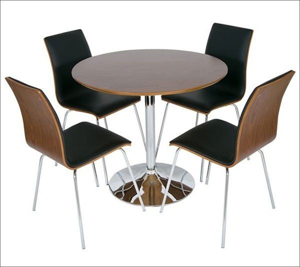 1. Được làm từ gỗ, crôm, bề mặt ghế ngồi giả da – bộ bàn ghế này trông rất thanh lịch với thiết kế mảnh mai, hoàn toàn phù hợp với những phòng ăn nhỏ. Bộ sản phẩm gồm 1 bàn tròn và 4 ghế đơn. Bề mặt ghế ngồi có hai màu trắng hoặc đen. Kích thước 75 x 75 x 90 cm, giá thành khoảng 5.600.000 đồng.